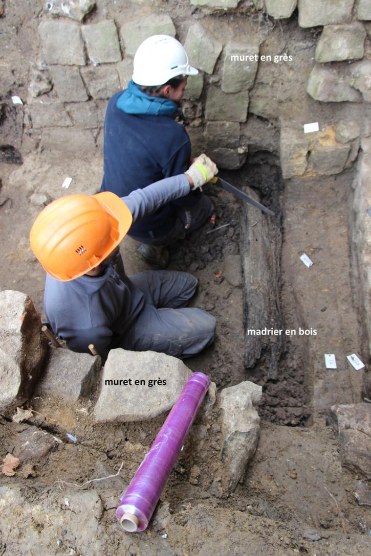 Des archéologues réalisent le prélèvement d’un bois en vue d’une datation. Ce madrier, situé devant l’entrée du cellier, soutient la passerelle. Elle passe entre les murets en grès qui maintiennent deux petites terrasses.