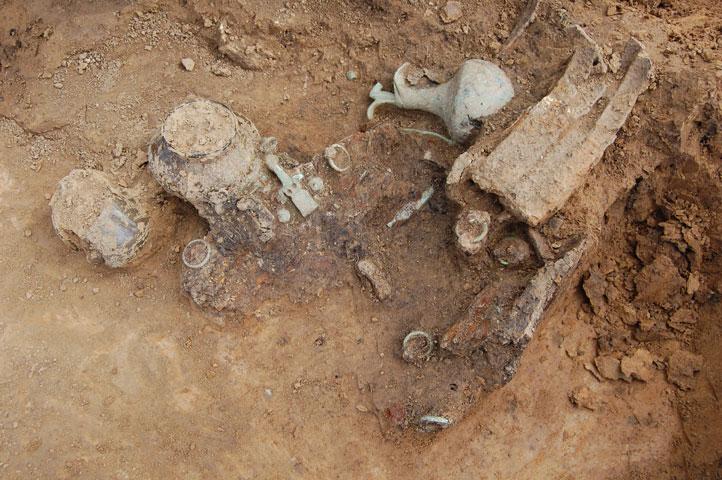 Les sépultures à incinération sont riches en offrande : celle ci-dessus a livré à elle seule une œnochoé (ou cruche) et une patère (ou poêle) en bronze, trois strigiles en fer (petit couteau utilisé pour le nettoyage de la peau), un coffre en bois, de la céramique ainsi que de la verrerie.