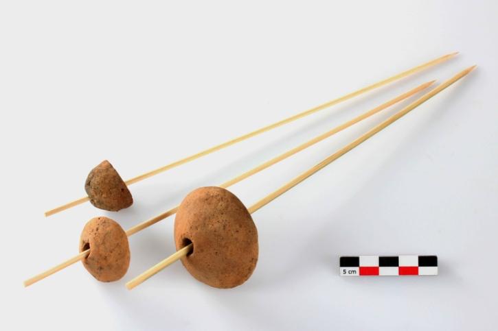 La présence de pesons atteste indirectement de l’activité de tissage, même si les métiers à tisser en bois ne nous sont pas parvenus. Ils servent à tendre les fils verticaux de la trame du tissu.