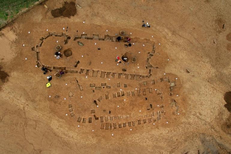 Les fondations des deux grands bâtiments ont été entièrement fouillées. Les poteaux faîtiers et intermédiaires ainsi que la tranchée de fondation des murs sont très visibles.