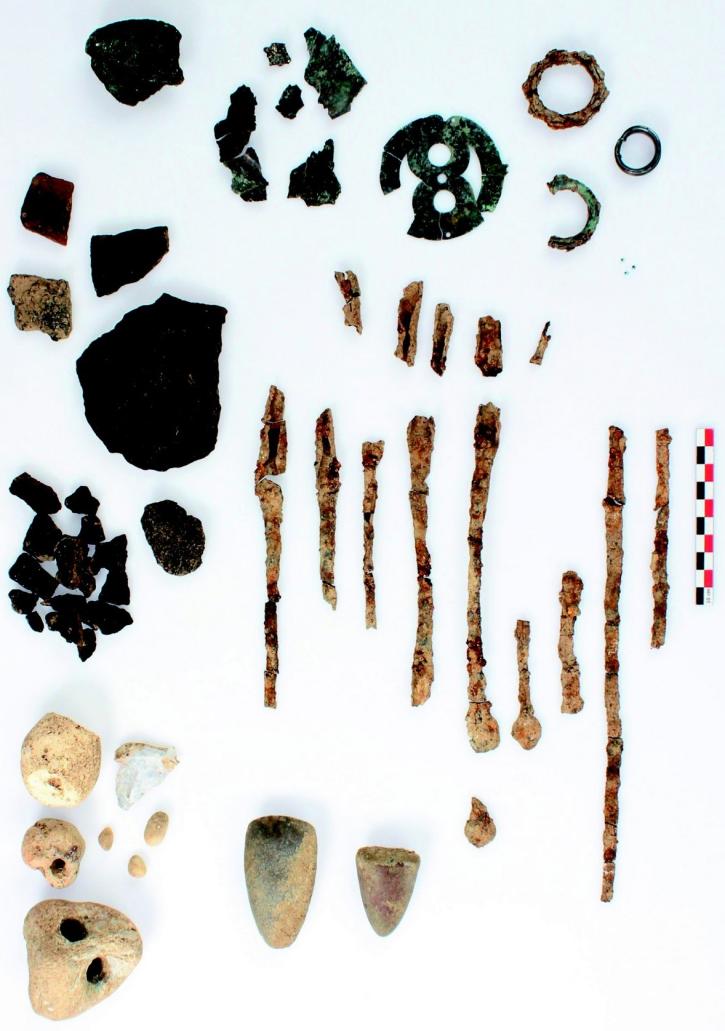 Dans l’un des trous de poteaux, les archéologues ont mis au jour un dépôt de divers objets. Ce dépôt se compose d’objets en métal et en silex. Il s’agit notamment de lingots de fer sous forme de barre à douille, d’anneaux en fer ou en bronze, d’une plaque décorative en bronze, de haches polies en silex ou de silex naturellement percés et de quelques fragments de céramique.